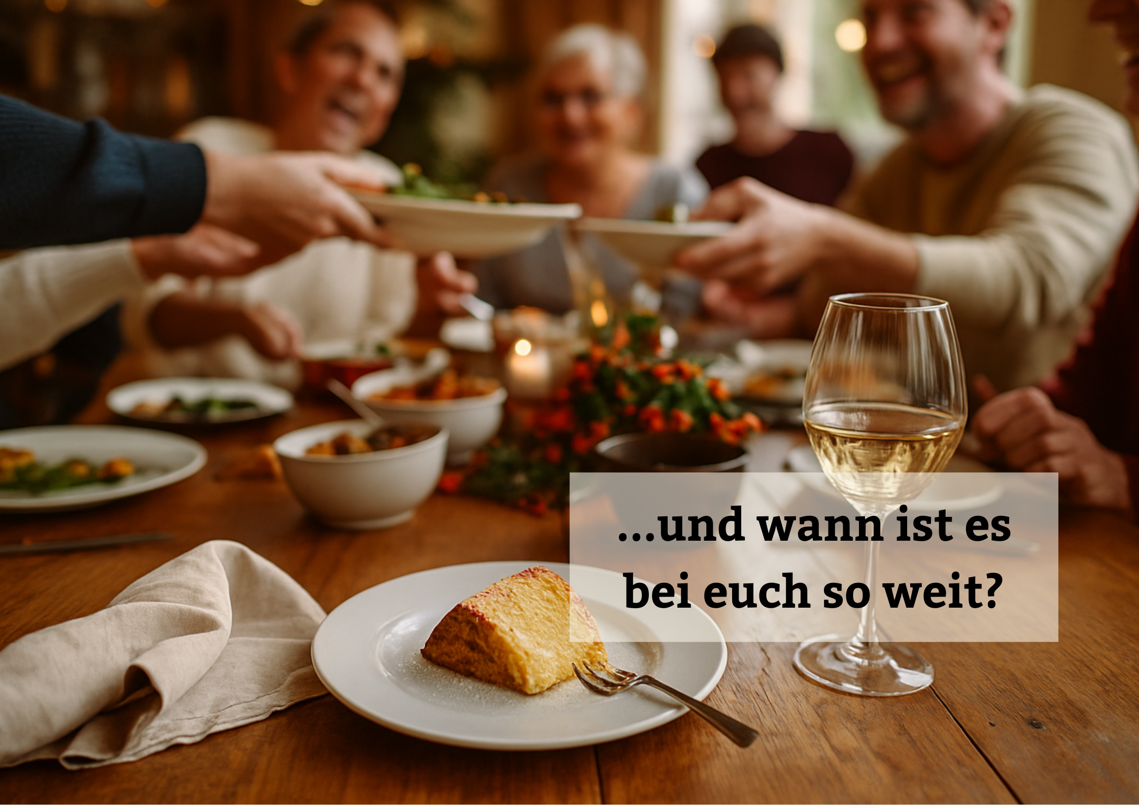 Es gibt diesen Moment auf Familienfeiern, der so zuverlässig kommt wie das Kartoffelsalat-Rezept, das seit 1978 niemand ändern darf. Man sitzt noch nicht einmal richtig, da beugt sich eine Tante, eine dieser Wohlmeinenden mit zu viel Interesse und zu wenig Filter, ein Stück zu nah herüber und fragt: „Sag mal Liebes, wann ist es denn bei euch soweit?“